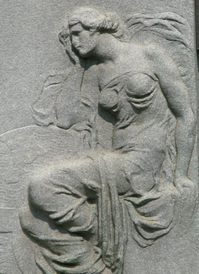 This is a detail carved into the side of a pillar that holds a bronze bust of some old white dude.